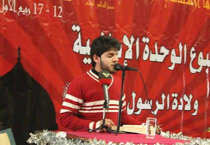 افتتح الحفل بتلاوة مباركة من القرآن الكريم، وقصائد شعرية في مدح الرسول الأعظم(ص) نظمها وألقاها الشاعر علي طالب .