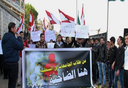 تنديداً بالعدوان التكفيري على الضاحية الجنوبية-بيروت، نفذ طلاب الجامعة اللبنانية كلية ادارة الاعمال في مدينة النبطية اعتصاماً في باحة الجامعة دعماً لأهالي الضاحية واستنكاراً للتفجيرات الارهابية، وقد عبرت كلمات الطلاب عن دعمها لخيار المقاومة والدعوة لتكاتف اللبنانيين مع بعضهم لوأد الفتنة التي لا تميز بين لبناني وآخر.