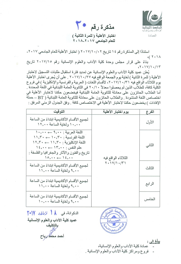 النافذة التربوية :: مذكرة رقم 20 اختبار الأهلية (للمرة الثانية) للعام الجامعي 2017 - 2018 (كلية الآداب والعلوم الإنسانية)
