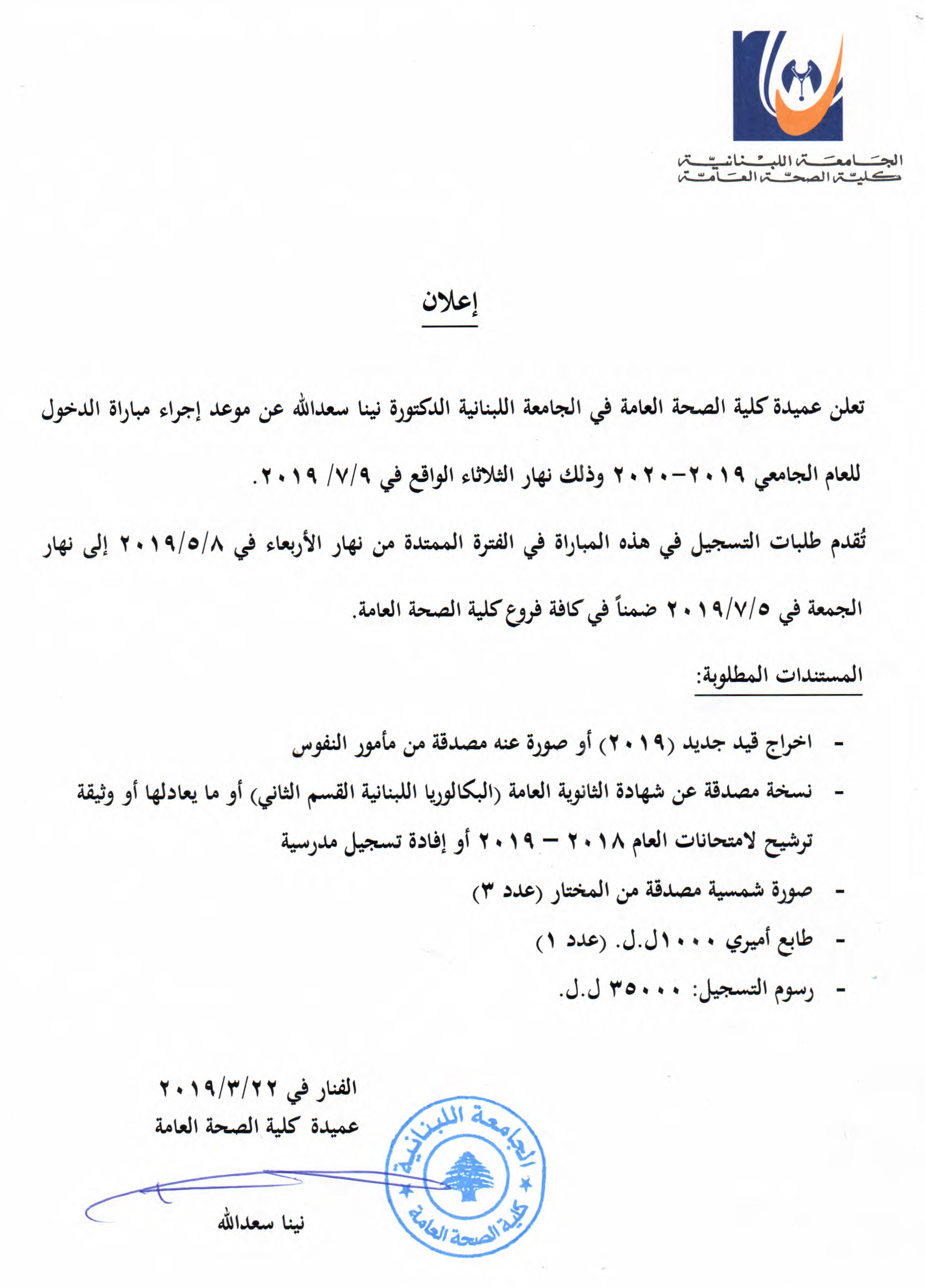 أعلنت كلية الصحة في الجامعة اللبنانية عن موعد إجراء مباراة الدخول للعام الجامعي 2019 – 2020 نهار الثلاثاء في 9 تموز 2019، على أن تُقدم طلبات التسجيل في هذه المباراة في الفترة الممتدة من 8 أيار 2019 حتى 5 تموز 2019 في كافة فروع الكلية.