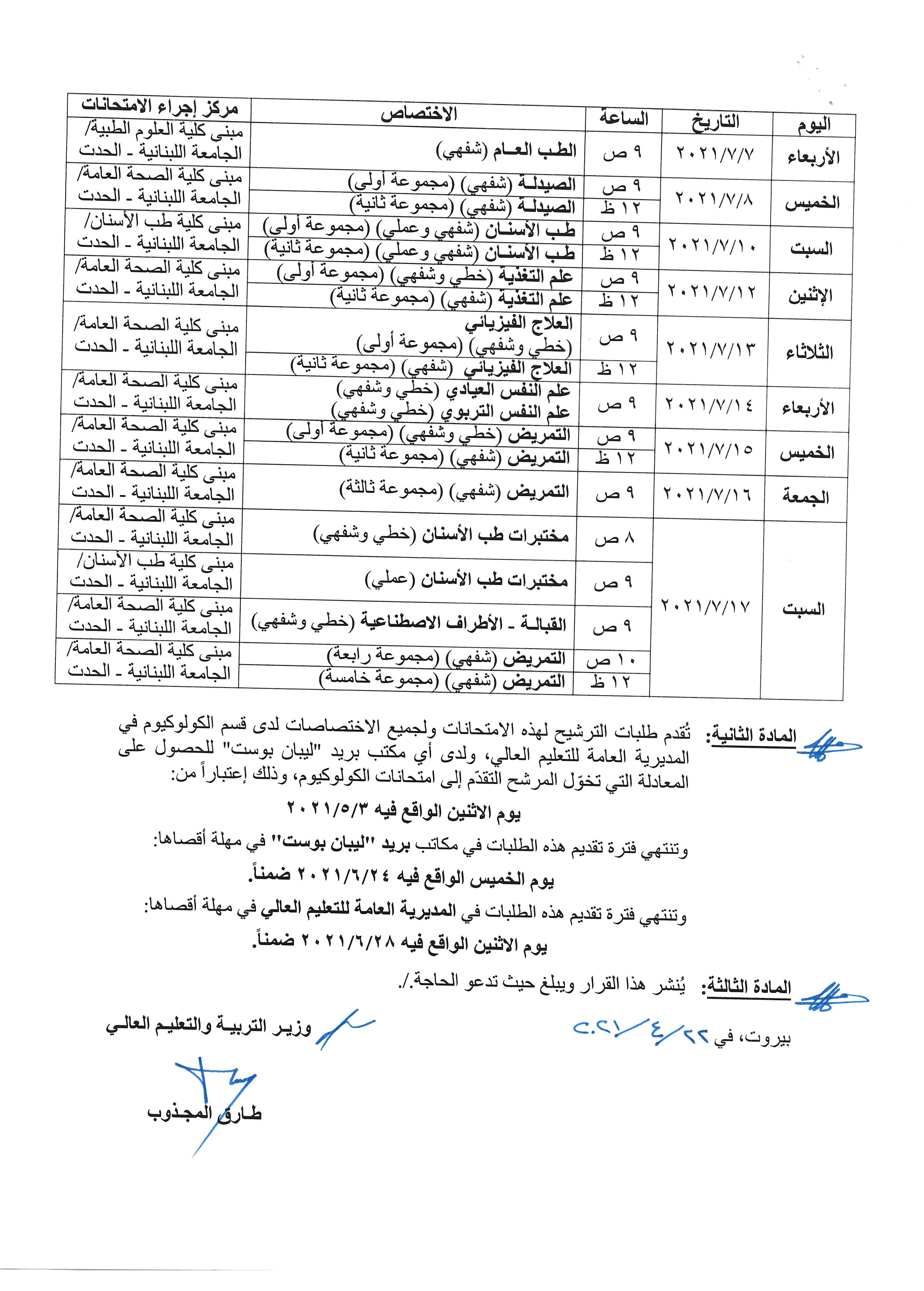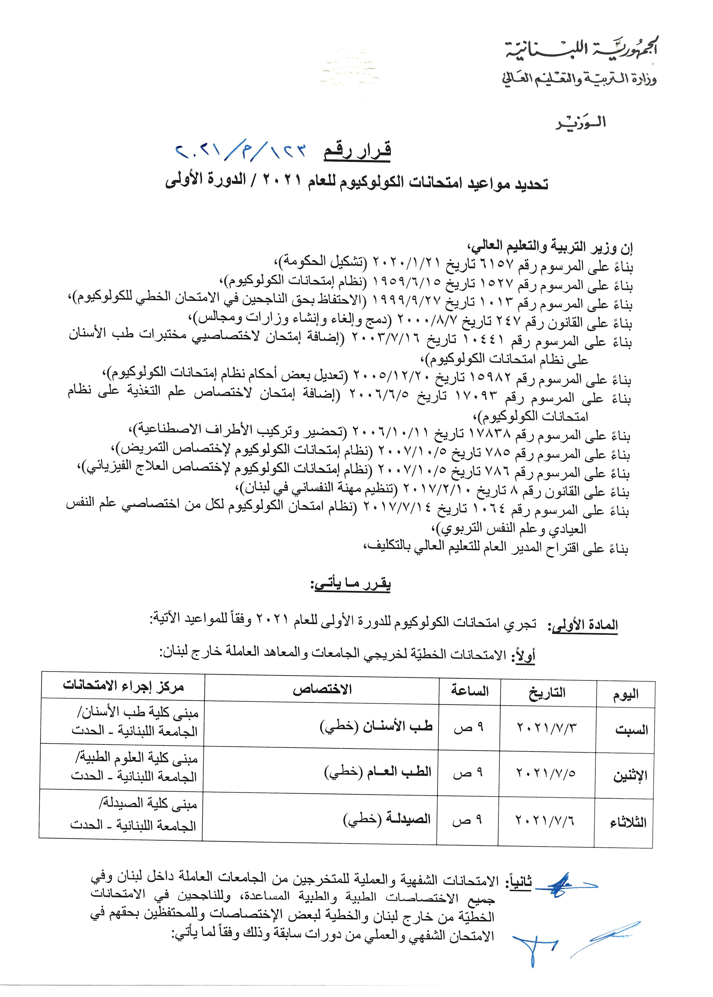 صدر عن وزير التربية والتعليم العالي في حكومة تصريف الاعمال طارق المجذوب، قرار حمل الرقم 123/م/2021، حدد فيه مواعيد امتحانات الكولوكيوم للعام 2021- الدورة الاولى.