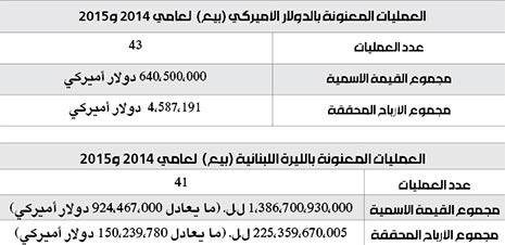 بلغ عدد العمليات التي تم إبلاغنا عنها، والتي تتوافق مع المعيار المحدد أعلاه، 183 عملية تداول مجموع قيمتها التعاقدية 2.6 مليار دولار نتج منها أرباح رأسمالية بقيمة 154 مليون دولار أميركي خلال فترة السنتين (2014-2015). تمت هذه العمليات مع جهة تابعة هي (Medfinance Services LTD)، مصرف لبنان ومصارف ومؤسسات محلية وأجنبية عديدة.