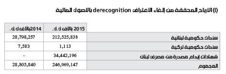 الأرباح الناتجة من إلغاء الاعتراف derecognition بالسندات الحكومية اللبنانية تعود في الأساس إلى عمليتي تصفية سندات حكومية لبنانية قيمتهما الاسمية الإجمالية 221.5 مليار ليرة لبنانية (سندات بقيمة 178 مليار ليرة لبنانية استحقاق حزيران 2023 وسندات بقيمة 43.5 مليار ليرة لبنانية استحقاق أيلول 2023) و201.9 مليار ليرة لبنانية (سندات بقيمة 100 مليار ليرة لبنانية استحقاق حزيران 2022، سندات بقيمة 51.3 مليار ليرة لبنانية استحقاق كانون الثاني 2025 وسندات بقيمة 50.6 مليار ليرة لبنانية استحقاق أيار 2025) ليبلغ مجموعها ما يعادل إجمالي التدفقات النقدية المستقبلية غير المخصومة من أصل وفوائد حتى الاستحقاق. إن الأرباح المعترف بها من هاتين العمليتين، بعد حسم عمولات بمبلغ 20 مليار ليرة لبنانية و55.1 مليار ليرة لبنانية، على التوالي، بلغت 132.5 مليار ليرة لبنانية و64.1 مليار ليرة لبنانية على التوالي.