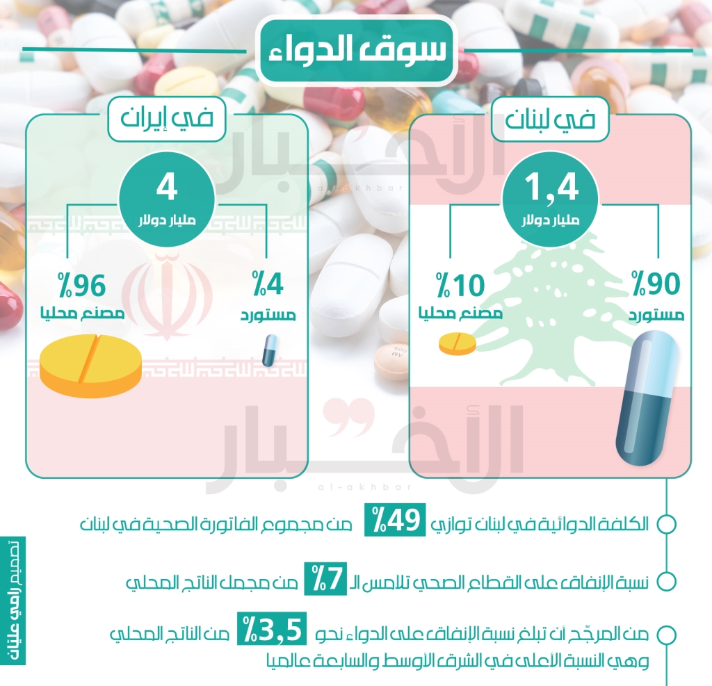 بحسب المسؤولين الإيرانيين، فإنّ بلادهم تنتج نحو 96% من الأدوية (الـ4% التي تستوردها عبارة عن لقاحات وبعض أدوية السرطان المحددة)، ويبلغ حجم إنتاج الدواء فيها أكثر من 4 مرات من حاجة السوق المحلي، لذلك تُصدّر أدويتها إلى نحو 30 بلداً بقيمة نحو 150 مليون دولار سنويا. أمّا سعر الأدوية المُنتجة إيرانياً فيقل بنحو 90% عن سعرها في بقية الدول المصنّعة للدواء نفسه. في المقابل، يستورد لبنان نحو 90% من الأدوية التي تسوّقها شركات أجنبية كبرى، سواء بشكل مباشر أو عبر مستودعات متعاقدة لتأمين استيراد منتجاتها الأغلى ثمنا، فيما يُشكّل الدواء المُصنّع محليا نحو 10% فقط من حجم السوق (10 مصانع مسجلّة محلياً تواجه تحديات عدة أبرزها منافسة مستوردي الشركات العالمية للادوية والمنتجة للأدوية الأصلية).