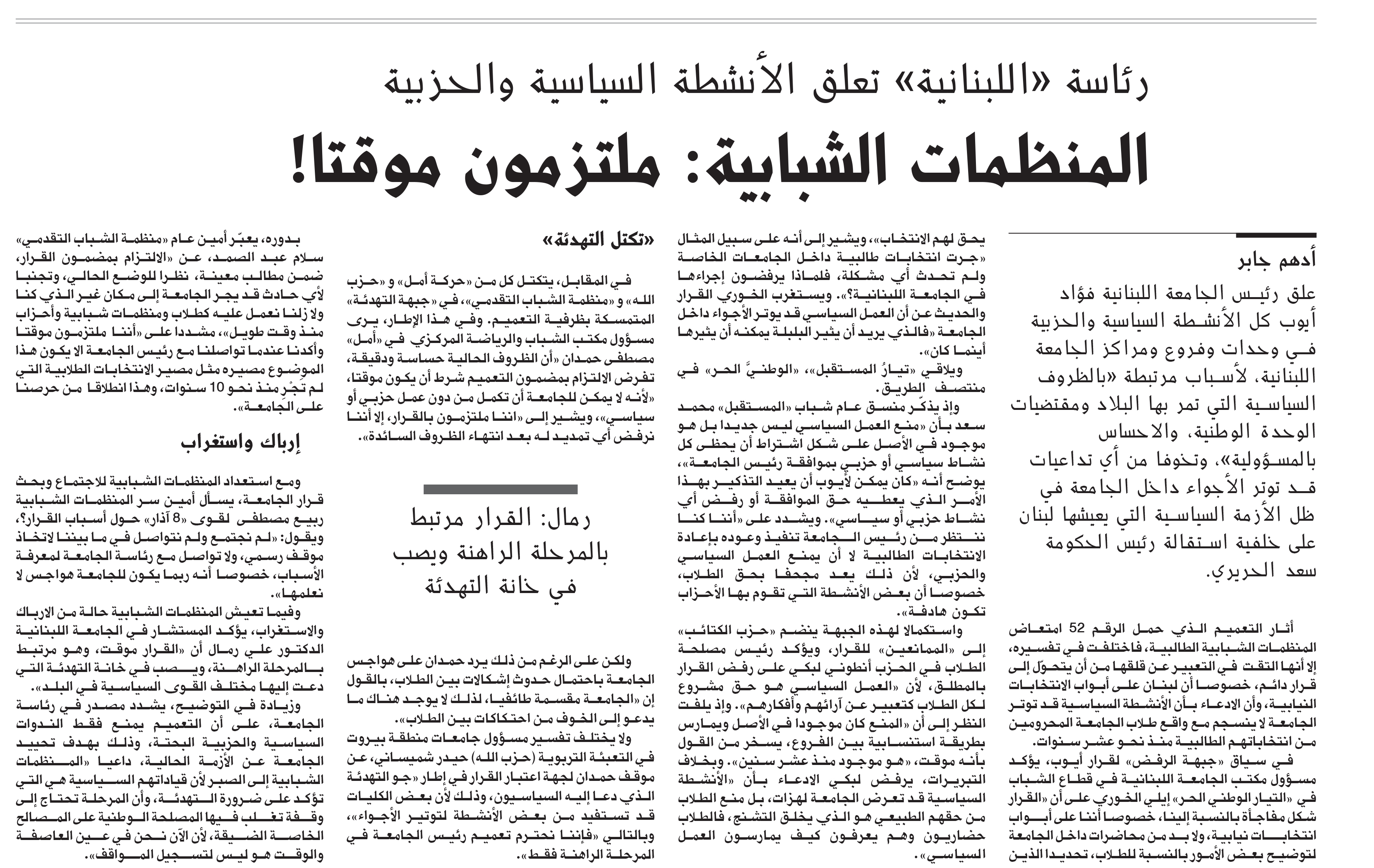 المراهنة على وعي الطلاب أمر جوهري، بالنسبة إلى بلال المير، مسؤول المكتب الطلابي المركزي في تيار المستقبل. بدا المير مستفزاً من تعميم الرئيس الذي وصفه بـ«التعسفي، لكونه يعالج مشكلة بمشكلة أكبر». يقول: «كنا نتوقع تحديد موعد قريب للانتخابات وإعادة الحياة السياسية الديموقراطية إلى الجامعة، فإذا برئاسة الجامعة تتذرع بالظروف القاهرة لضرب التواصل بين الطلاب الذي يحدث عادة خلال الأنشطة».