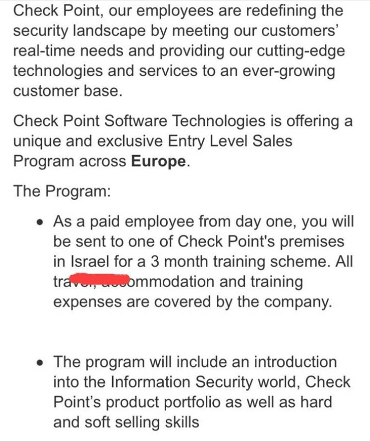 الدعوة جاءت عبر "ايميل" ارسله القسم المعني بتأمين الوظائف أو التدريب (ما يعرف بالتجربة او الستاج) في الجامعة الاميركية في بيروت الى طلابهم يدعوهم فيه الى التوجه الى احدى مقرات شركة "Check Point" المتخصصة في أمن المعلومات ومقرها الرئيس في "اسرائيل" للخضوع لبرنامج لمدة ثلاثة أشهر هناك. وتشير عدة تقارير صحفية أن الشركة يستخدمها "الموساد" الاسرائيلي كساتر لجذب الأدمغة في عالم البرمجيات، فضلاً عن تجنيد الخبراء منهم لصالحه في الدول التي يأتون منهاـ وتعرض الشركة وفق رسالة الجامعة تحمّل كافة تكاليف سفر وإقامة الطلاب اللبنانيين في الكيان الاسرائيلي.